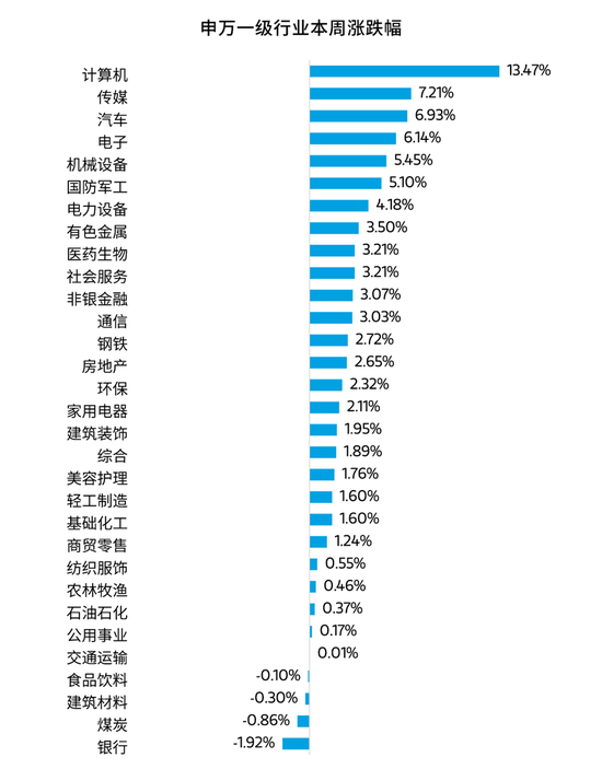 行业进展方面,申万一级行业指数中,假想机、传媒、汽车等板块进展较好,银行、煤炭、开采材料等板块进展较差。