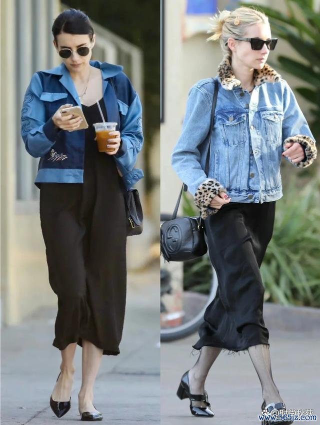 比如石头姐内部穿了一件玄色的长连衣裙,显瘦显高,外面套一件牛仔衣,就以为又帅气又有女东说念主味了,包包与鞋子也接收了跟裙子不异的玄色,整套的搭配惟有两个心机,看起来很高等。