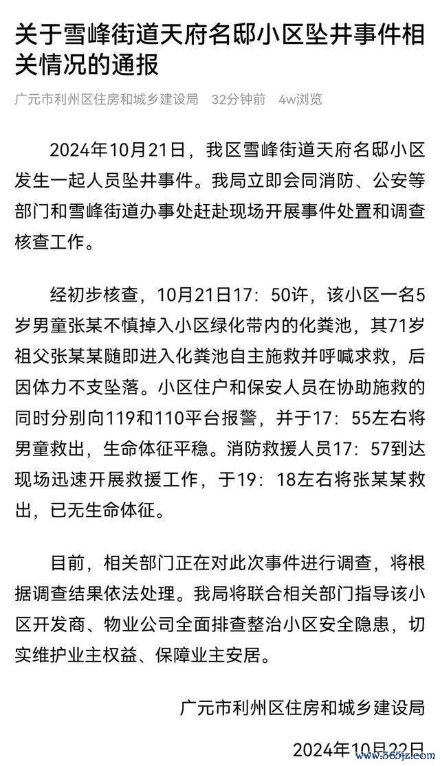 经初步核查,10 月 21 日 17:50 许,该小区别称 5 岁男童张某失慎掉入小区绿化带内的化粪池,其 71 岁祖父张某某当场过问化粪池自主施救并呼喊求救,后因膂力不支陨落。小区居民和保安东谈主员在协助施救的同期分歧向 119 和 110 平台报警,并于 17:55 独揽将男童救出,人命体征安谧。消防赞成东谈主员 17:57 到达现场速即开展赞成使命,于 19:18 独揽将张某某救出,已无人命体征。