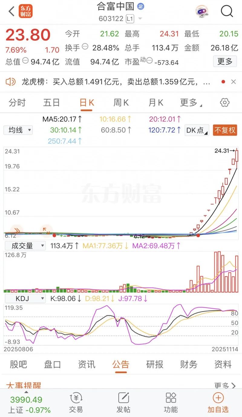 值得关切的是,就在11月14日,合富中国发布公告明确表态“股价若接续相等高潮,可能肯求停牌核查”;与此同期,上海证券来回所也已两次将合富中国列为“严重相等波动”场地,并造就可能对关连账户聘请来回戒指;兴业证券等券商也向客户发出风险教唆,强调该股已被来回所重心监控。
